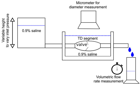 Illustration of the bench setup used the measure change in outer diameter and volumetric flow rate through the TD segment for an imposed pressure gradient.