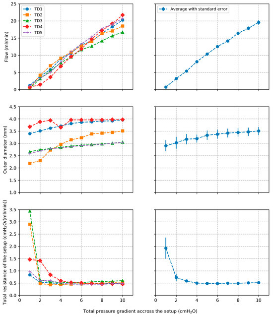 Plots of volumetric flow rate, outer diameter, and total resistance of the setup along with average values and standard errors across all tested segments.