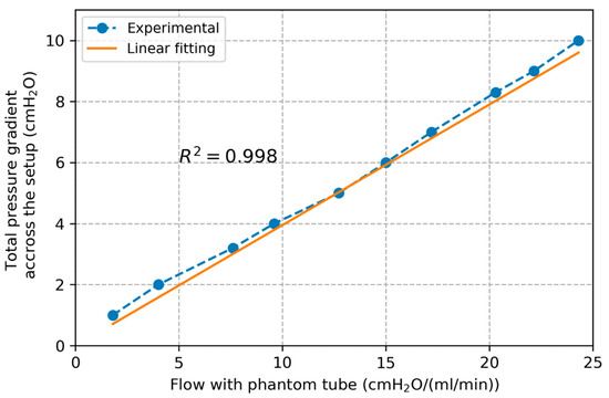 Plots of volumetric flow rate against pressure gradient across the setup are presented in Figure 4 for the test with phantom tube. The pressure–flow relation was verified to be linear as assumed ( for the linear correlation) with a slope of 0.395 cmH2O/(mL/min) corresponding to the total resistance of this setup. From Equation (4) we found cmH2O/(mL/min). Finally, was subtracted from the total resistance of the system to return the value of cmH2O/(mL/min).