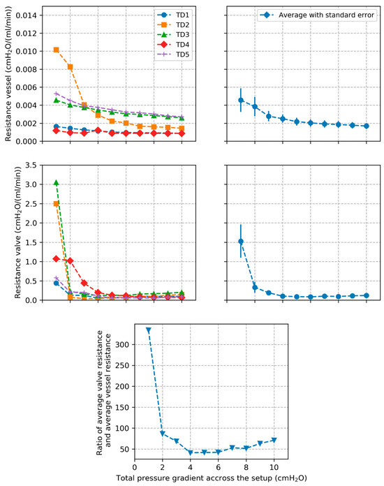 Plots of vessel resistance and valve resistance estimated from Equations (5) and (6), respectively, are shown in Figure 5 for the individual segments along with average behavior and standard errors. Evolution of the average / ratio over all TD segments is also presented.