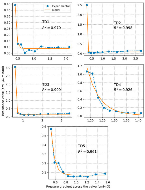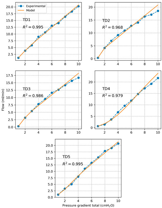 where the superscript indicates model based values, and (>0) and A (no bounds) designate a model parameter. Using resulting values from the fitting and the value of obtained with Equation (6) based on the experimental data, the model parameters , , and were established through model fitting. The model was validated by comparing experimentally measured flow for each TD segment to flow estimated based on valve resistance model: