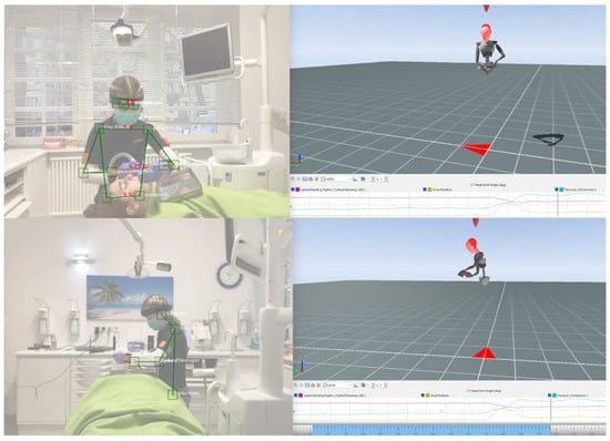 Alvarez [35] evaluated the accuracy of MoveNet in estimating joint angles and found that the average root mean square error (RMSE) was approximately 12°, whereas the implementation of a linear regression model reduced the RMSE to an average of 5°. However, the accuracy of MoveNet can be influenced by factors such as movement type, speed, and environmental conditions. Furthermore, owing to the dental setup, MoveNet had problems recognizing some of the joint marks (such as the wrists and hips) as reference values for trunk posture, comparable to the findings of another study [21]. In addition, because the dental assistant was sitting in front of the patient, measurements had to be repeated due to recognition of the patient’s body parts instead of those of the dental assistant. In OpenPose, another vision-based pose estimation method, Chen et al. [36] showed an accuracy of 97% in velocity, angle, and ratio. Kim et al. [10] reported that OpenPose has the potential to measure joint angles and perform semiautomatic ergonomic assessments; the overall total mean RMSE of the joint angles was 8.4°. Li et al. [17] estimated the RULA score from 2D human poses encoded with three-dimensional pose information, achieving a 93% accuracy in RULA action level classification. Furthermore, average joint center differences between 10 and 50 mm using multicamera markerless systems with OpenPose have been reported [37]. Therefore, this method might not offer the required accuracy to fully replace biomechanical applications at this point [19].
