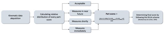 Kinematic data from the IMU-based MoCap (see Figure 3) were merged using MATLAB software (R2023a, The MathWorks, MA, USA), adapted to a self-written RULA evaluation scheme. Finally, the RULA score was determined from the relative time spent in each RULA score level (1–7) [13] (see Figure 4).