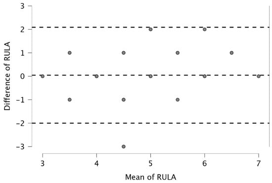 Figure 5 presents the Bland–Altman plot of the RULA scores. All data were within the fluctuation range except for that of one participant. Bland–Altman plots of the body parts are presented in the Supplementary Materials.