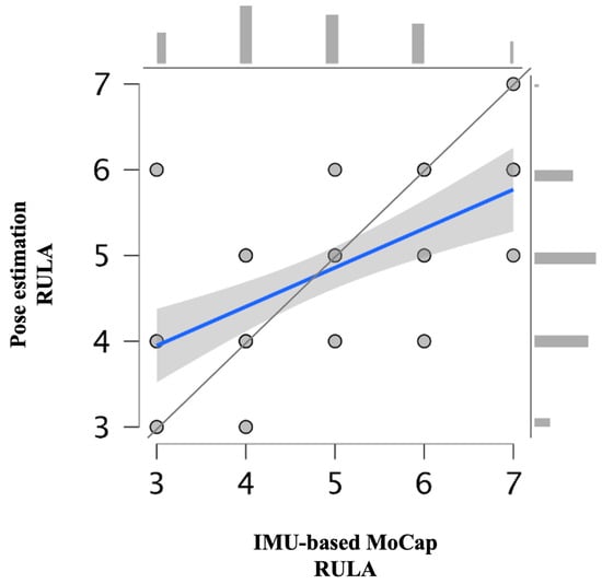 Scatter plot and histograms (above and right) representing overall RULA scores from pose estimation and inertial measurement unit-based motion capture including data trend line (blue) and 45° line (gray).