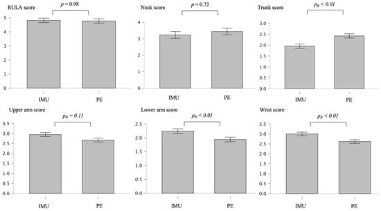 Mean differences and normalized error bars representing 95% confidence intervals regarding overall and body part RULA scores assessed by pose estimation (PE) and inertial measurement unit (IMU)-based motion. pB = Bonferroni-corrected p-value.