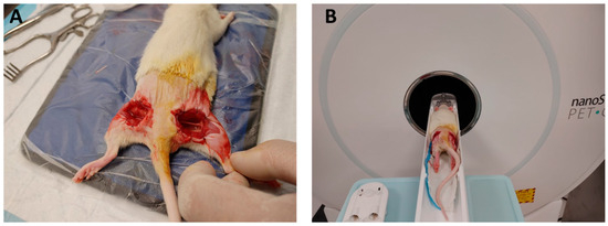 Setup for imaging the sciatic nerve. (A) Bilateral Transgluteal Approach of the Sciatic nerve. (B) Placement inside the imaging nanoScan PET/CT [18].