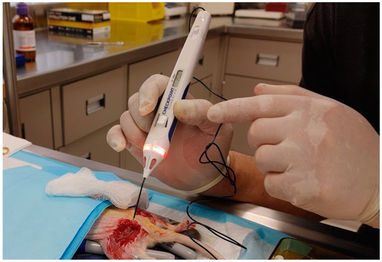 Nerve conduction was then investigated in the sciatic nerve receiving the contrast and the contralateral untreated sciatic nerve by applying a light pinch in each animal with repetitive grasping with a micro forceps for 10 s and with application of an electrical impulse using a nerve stimulator (Checkpoint Surgical, Inc., Independence, OH, USA) on continuous 150 μs pulse 0.5 mA for 10 s, while monitoring for limb movement (Figure 2). The presence or absence of paw plantarflexion reflected the paralyzing effect of the lidocaine derivative.