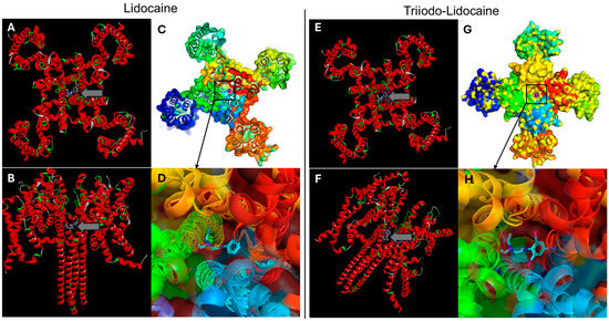 Molecular docking of lidocaine and triiodide lidocaine with a voltage-gated sodium channel, NavAb. The 3D structure of the NavAb voltage-gated sodium channel transport protein in a closed conformation (PDB: 5VB2) [16] was downloaded from the Protein Data Bank (https://www.rcsb.org/ (accessed on 11 April 2025)). (A) Top-down view of the channel, emphasizing the symmetrical arrangement of the helices around the central pore. Lidocaine is visible in the center. (B) A side view of the channel and the depth of lidocaine within the pore. (C) The surface presentation of the channel. Black arrow indicating the zoom-in section in the whole protein. (D) Zoomed view of the pore with an orientation of lidocaine inside the pore. (E) Top-down view of the channel, emphasizing the symmetrical arrangement of the helices around the central pore. Lidocaine is visible in the center. (F) A side view of the channel and the depth of triiodo-lidocaine within the pore. (G) The surface presentation of the channel. Black arrow indicating the zoom-in section in the whole protein. (H) Zoomed view of the pore with an orientation of triiodo-lidocaine inside the pore. Gray arrows show the positions of lidocaines within the channel. Locations and energies were calculated with the AutoDock Vina algorithm implemented in the PyRx Virtual Screening Tool. The surface plots use a jet color scheme, where the N-terminus is colored blue, and the C-terminus is colored red. The color gradient (blue → green → yellow → red) corresponds to the amino acid sequence progression, reflecting the residue numbering along the protein backbone.