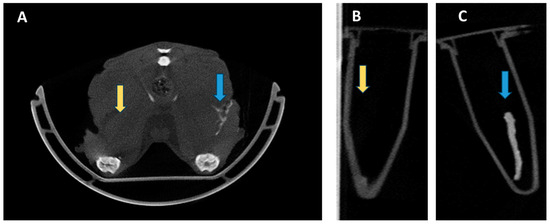 CT scan from the in vivo and extracted rat sciatic nerves. (A) Transaxial view of the mouse. The yellow arrow shows the location of a non-treated sciatic nerve, and the blue arrow shows the location of the nerve treated with triiodo-lidocaine. (B) CT scan from the extracted contralateral non-treated nerve placed in an Eppendorf tube. No signal is noted (HU < 20). (C) CT scan from the extracted non-treated sciatic nerve placed in an Eppendorf tube showing strong contrast.