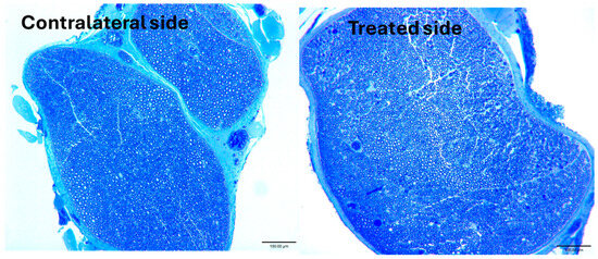 On gross inspection after the 10 min dwell time of the nerve contrast, none of the rats demonstrated evidence of soft tissue injury or injury to the nerve. Following the experiment, the sciatic nerves from both the control and lidocaine derivative-treated sides were excised for histological analysis. The nerves were processed with osmium tetroxide (OsO4) staining to highlight myelin integrity and further counterstained with toluidine blue for detailed morphological assessment. Histomorphometry analysis of the images (axon density, myelination level of axons, G-ratio; see the representative image in Figure 6) revealed no significant structural abnormalities in either group, indicating that despite the functional nerve blockade observed on the treated side, the underlying nerve architecture remained intact. This suggests that the triiodine lidocaine effectively inhibits conduction without causing detectable histological damage to the nerve, supporting its potential as a reversible nerve-blocking agent without inducing acute neurotoxicity and damage to the nerve.