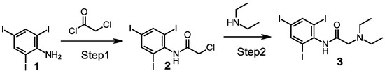 Synthesis of a 2,4,6 triiodo-substituted lidocaine performed by customer manufacturer Nanosyn Inc. 1—2,4,6-triiodo-phenylamine, 2—(2,4,6-triiodophenyl)-2-chloroacetamide, 3—2-(diethylamino)-N-(2,4,6-triiodophenyl)acetamide (final product).