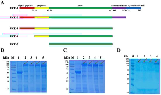 Four truncated variants, referred to as UCE-2, UCE-3, UCE-4 and UCE-5, were constructed (Figure 2A), and the corresponding DNA fragments were sub-cloned into pCold-MBP. Given that a UCE harbors a transmembrane domain at its C-terminus [,,,], some variants might be insoluble when expressed in E. coli. Thus, a widely applied soluble tag, MBP [,], was fused to the N-terminus of UCE to produce soluble proteins. After overnight incubation, the proteins of the supernatant and the cell pellets were analyzed by SDS-PAGE and Coomassie Brilliant Blue staining, respectively (Figure 2B,C). A band of ~100 kDa (MBP tag plus UCE variants, lanes 2 to 5 in Figure 2B,C) was detected in both the lytic supernatant and cell pellets of all the four variants. This proves that the four UCE variants, even with a transmembrane domain, can be soluble when fused with an MBP tag.