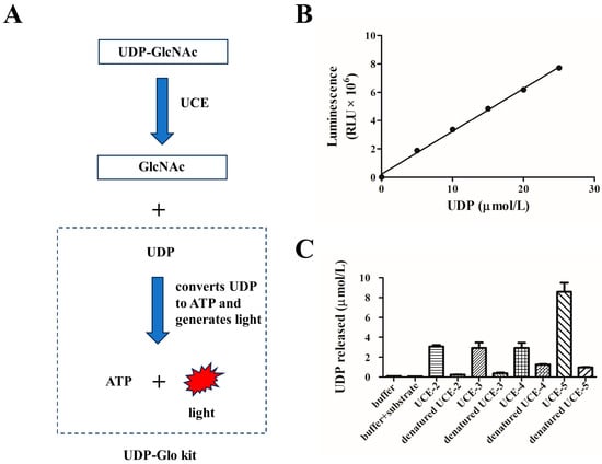 As mentioned above, the UCE has the ability to hydrolyze the masking GlcNAc group on the mannose phosphate moiety [,]. It is difficult to evaluate the uncovering activity directly by using glycans on lysosomal enzymes as the substrate. Alternatively, we chose uridine diphosphate–GlcNAc (UDP-GlcNAc) as the substrate. UDP-GlcNAc, a sugar nucleotide, is a common glycosyl donor in vivo and in vitro for GlcNAc transferase []. UDP-GlcNAc can be hydrolyzed and converted into UDP and GlcNAc by UCE. The UDP-Glo kit was used to convert UDP to ATP through a one-step reaction and generate light [] (Figure 3A). The luminescence intensity was detected and reflected the titer of the released UDP.