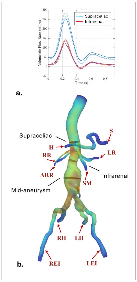 (a) The time-dependent flow rate at the supraceliac (SC) and at the infrarenal (IR) section. (b) The aorta branches at the downstream of SC: the celiac trunk (CT), superior mesenteric (SM), left renal (LR), right renal (RR), and accessory right renal (ARR) arteries. The aorta branches downstream of the IR: the right and left internal and external arteries (RII, REI, LII, and LEI). Adapted from [] under the terms of the CC BY 4.0 license.