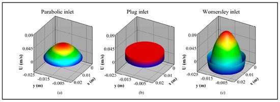 The idealized velocity profiles provided at the inlet of AAA models. (a) Parabolic; (b) plug (flat); and (c) Womersley profile. Reproduced from [] under the terms of the CC BY 4.0 license.