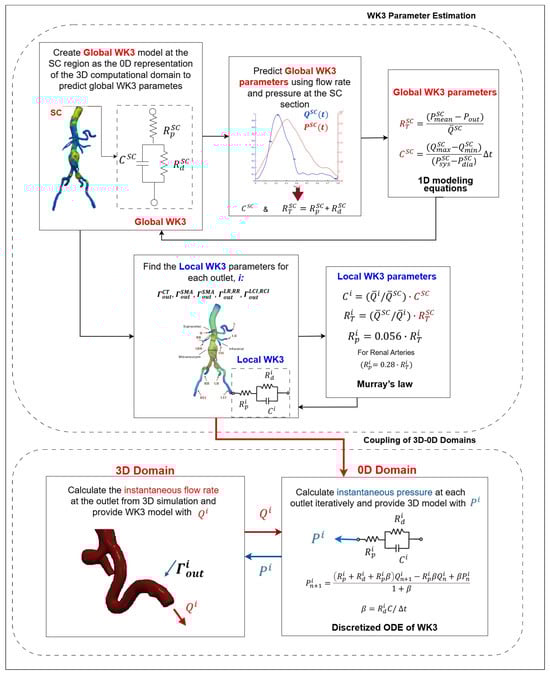 In the modeling of cardiovascular systems, various techniques have been developed. These can be categorized into low-dimensional (0D and 1D) [,,,] and high-dimensional (2D and 3D) [,,,,] methods, based on the dimensionality of the simulation [,,,]. Low-dimensional techniques are computationally affordable and suitable for capturing general flow features across the entire cardiovascular system []. Specifically, 1D models solve the Navier–Stokes equations along the arterial tree to predict the flow profiles and pressure waves as they propagate throughout the system [,,,,,,]. High-dimensional models can resolve detailed hemodynamic and biomechanical features in all spatial dimensions by solving governing equations in the solid and fluid domains. An AAA has a unique and complex geometry, with a wall thickness of around 1.5 mm []. Therefore, 3D patient-specific simulations are essential to achieve high-fidelity hemodynamic and biomechanic predictions.