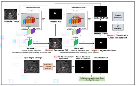 - López-Linares, K.; Aranjuelo, N.; Kabongo, L.; Maclair, G.; Lete, N.; Ceresa, M.; García-Familiar, A.; Macía, I.; González Ballester, M.A. Fully Automatic Detection and Segmentation of Abdominal Aortic Thrombus in Post-Operative CTA Images Using Deep Convolutional Neural Networks. Med. Image Anal. 2018, 46, 202–214. [Google Scholar] [CrossRef]
