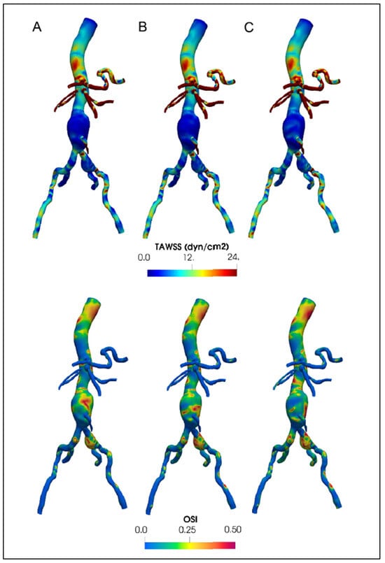 There are many modeling and simulation studies that have been commonly used in recent years to investigate the hemodynamic and biomechanical properties of AAAs and their rupture risk. Rupture tends to occur in areas of low WSS and flow recirculation, rather than in regions of high pressure and WSS, which conflicts with earlier finite element analysis (FEA) studies []. The AAA wall stress distribution is significantly influenced by aneurysm asymmetry and wall thickness variations. Models with variable wall thickness have shown up to a four-fold increase in peak wall stress compared to those with uniform thickness. Accuracy of wall thickness in computational models to predict AAA rupture risk is emphasized by combining FEA and the fluid–structure interaction (FSI) []. Patient-specific FSI models of AAAs have proved that wall stress distribution and WSS are thoroughly affected by the interaction between blood flow and the arterial wall. These models show that high wall stress regions often align with complex flow patterns, which carry higher risk in the context of ruptures. Considering fluid dynamics together with wall interactions offers a more realistic simulation of in vivo conditions, compared to models that do not include the flow effects [].