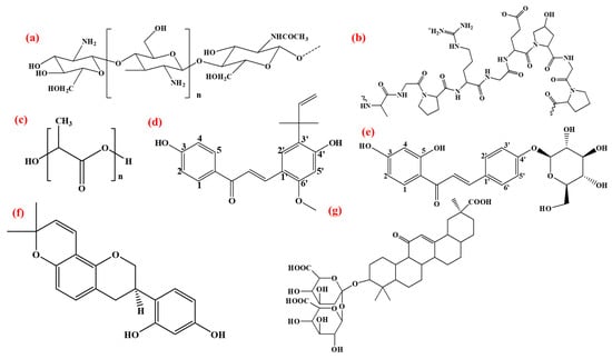 Structure of (a) chitosan, (b) gelation, (c) PVA, and active components of licorice: (d) licochalcone A, (e) isoliquirtin, (f) glabridin, (g) glycyrrhizin.