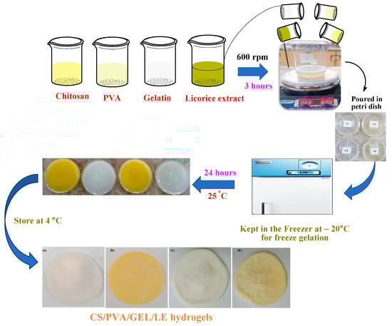 Schematic representation of the preparation of CS-PVA-GEL-LE hydrogels.