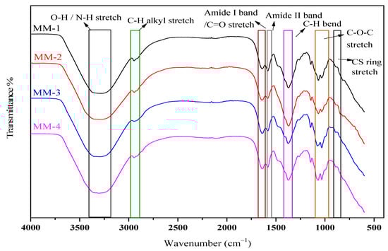 FTIR was performed to examine the intermolecular interactions between the different functional groups of individual components found in synthesized hydrogels. All the synthesized hydrogels’ FTIR spectra have been displayed in Figure 3, which shows a relatively broad peak between 3370 cm−1 and 3220 cm−1 due to overlapped stretching frequencies of the hydroxyl (O-H) and amino (N-H) groups. Between 2960 cm−1 and 2910 cm−1, both symmetric and asymmetric stretching frequencies of the alkyl C-H groups were observed. Peaks of amide I and amide II bands appeared at 1669 cm−1 and 1654 cm−1, respectively []. A small peak at 1600 cm−1 represents the carbonyl (C=O) stretch, which is present in chitosan’s structure due to non-deacetylated groups []. A sharp peak between 1066 cm−1 and 1018 cm−1 indicates a stretching vibration of C-O-C in pure chitosan. Chitosan’s ring stretching vibrations appeared in the fingerprint region at 895 cm−1 []. It has also been observed that N-H/O-H stretching vibration peaks became broader and lost their sharpness in MM-2 and MM-4 hydrogels as compared to MM-1 and MM-3 hydrogels spectra. This might be due to the addition of LE and the presence of certain hydroxyl groups of polyphenols in LE. Similarly, slight changes in certain other peak frequencies in MM-1 and MM-3 (without LE) as compared to MM-2 and MM-4 (incorporating LE) were also noticed.