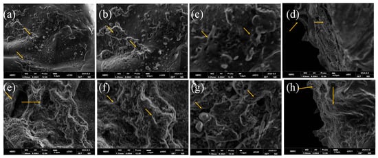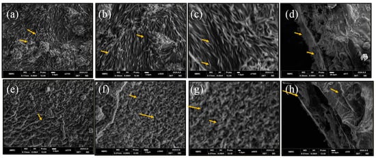 Surface SEM images of MM-3 (a–c), while cross-sectional image of MM-3 (d) and surface images of MM-4 (e–g), while cross-sectional image of MM-4 (h); represents porous network (shown with arrows) within hydrogels. The pore size of MM-3 is 18.83 ± 5 µm and MM-4 is 25.06 ± 5 µm.
