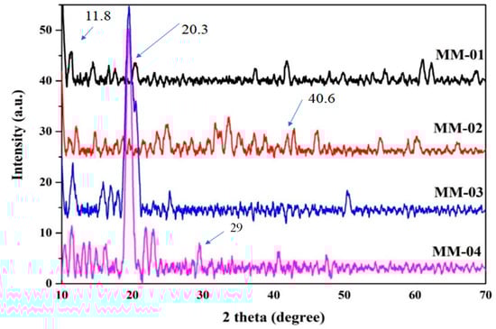 To determine whether the composite hydrogels were crystalline or amorphous in nature, X-ray diffraction (XRD) analysis was conducted. The XRD graphs of all synthesized composite hydrogels are shown in Figure 7. The peaks observed at 2θ = 11° in XRD graph of MM-1 and MM-3 were diminished due to the presence of gelatin, which is amorphous and alters the crystalline structure of PVA. CS typically exhibited a very sharp peak at 2θ = 20.5° in MM-3 and MM-4 hydrogels’ spectra. Another peak with low intensity appeared at 2θ = 40°, which was due to the presence of CS polymer [].