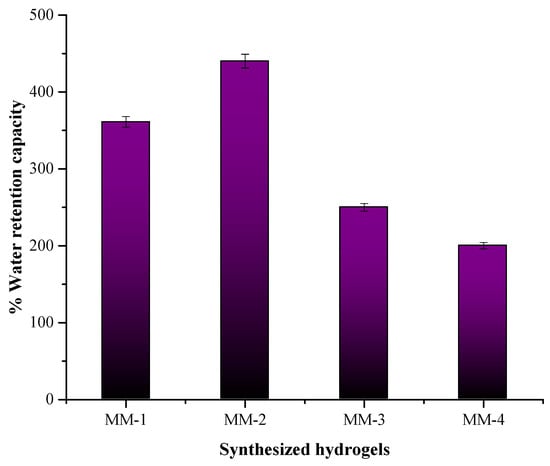 The water retention capacity of the prepared hydrogels was evaluated by taking small pieces of the hydrogels. The hydrogel pieces were weighed accurately and then immersed in deionized water at room temperature. The hydrogels were removed after every 30 min to check their weight gain and then immersed back in water until they absorbed maximum and no further gain in weight was noted. The hydrogels were then dried at room temperature for 24 h, and their final weight was measured []. Equation (3) was used to measure the water retention capacity percentage of synthesized hydrogels.