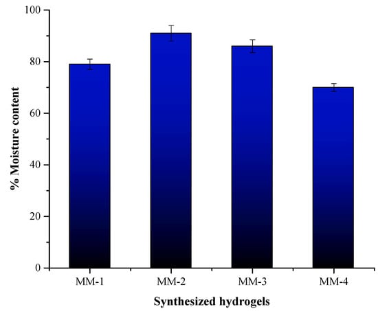 Percent moisture content is a vital parameter for hydrogel performance and is shown in Figure 9. The MM-2 hydrogel demonstrated the highest moisture content percent, i.e., 91%. This high moisture content percent was credited to the presence of a higher ratio of PVA and also due to the incorporation of LE. This feature of hydrogels is important for such wounds that need constant hydration, as it maintains moisture in the wound bed, which ultimately promotes tissue regeneration, cellular migration, growth, and speeds up the healing process. In contrast, MM-4 hydrogels exhibited the lowest percent moisture content, likely due to their reduced PVA content. As illustrated in Figure 9, MM-1 and MM-3 also showed notable percent moisture absorption content, reaching 79% and 86%, respectively.