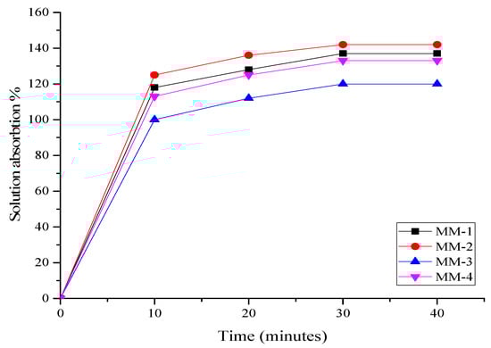 The synthesized hydrogels were placed in a PBS solution with a pH of 7.4 at 37 °C to assess their percentage of solution absorption. Figure 10 illustrates the findings of this test. The graph indicated that all hydrogels nearly reached their maximum absorption within the first 10 to 20 min, as detailed in Table 3. After 30 min, no additional absorption was observed, and the weight of all hydrogels remained constant. The results revealed that the MM-2 hydrogel absorbed the most solution due to its higher PVA content and porous structure. The hydrophilic properties of PVA make it suitable for absorbing more solution []. The synthesized hydrogels MM-1 and MM-2, which contain a higher proportion of PVA, have absorbed the most due to their hydrophilic properties. Similarly, the MM-4 hydrogel absorbed more solution compared to the MM-3 hydrogel. Hydrogels with a greater capacity for solution absorption are more suitable for exuding wounds, as they can manage essential wound fluids and help prevent infections [].