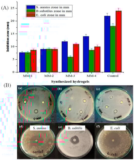 (A): Graphical representation of antibacterial activities of all hydrogels and their controls. (B): Antibacterial activities of hydrogels (a–c) in terms of inhibition zone. While control of S. aureus (d), control of B. substilis (e) and control of E. coli (f).