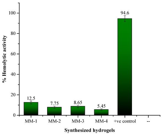 A hemolytic assay was conducted on CS/PVA/GEL hydrogels with and without LE, using bovine red blood cells, with results shown in Figure 12. All of the synthesized hydrogels demonstrated non-toxicity to the bovine red blood cells. The negative control (PBS solution, pH = 7.4) showed 0% RBCs lysis, while the positive control (Triton 0.1% X-1000) resulted in 94.6% lysis. Amongst MM-1 and MM-3 hydrogels (without LE), the MM-3 hydrogel showed less cytotoxicity (8.65%) due to the presence of a higher CS ratio. The presence of primary amino groups (-NH2) became protonated, or positively charged at physiological pH, thus CS gently interacts with negatively charged biological membrane constituents (such as phospholipids), lowering the possibility of membrane damage []. The MM-2 and MM-4 hydrogels (with LE) exhibited the lowest cytotoxicity with 7.75% and 5.45%, respectively. This was mainly due to the presence of flavonoids, glycyrrhizin, and other non-toxic components in LE. These bioactive components preserve cell membranes and reduce oxidative and inflammatory harm, thereby maintaining the integrity of RBCs and ensuring that the hydrogel can be applied to wounds without causing hemolysis. Among the various hydrogels, MM-4 demonstrates the least cytotoxicity due to its higher CS content and presence of LE [].
