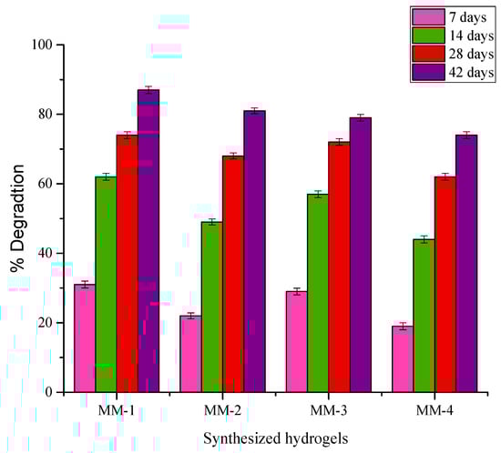 The hydrogel components, including CS, PVA, and GEL, have low cytotoxicity and are well-known biocompatible materials [,], as they do not produce undesirable, harmful byproducts when they break down. The hydrogel’s degradation time should be calculated to correspond with the time needed for new tissue to grow []. For better healing or regeneration processes to be successful and seamless, the hydrogel degradation and tissue regeneration processes must be synchronized. Figure 13 shows the % degradation of hydrogels submerged in a PBS solution of pH 7.4 at 37 °C for 42 days. Hydrogels are hydrophilic in nature, and when exposed to PBS solution, water molecules interact with polymer chains by penetrating into the network of polymers, causing the hydrogels to swell. The probability of hydrolytic cleavage rises with increased water absorption []. It was noticed that increasing PVA content has increased the % degradation of hydrogels. Thus, the increased PVA ratio in MM-1 and MM-2, as compared to MM-3 and MM-4, has resulted in more degradation of these hydrogels. The hydrophilic nature of PVA encourages more water absorption, and hydrolytic breakdown occurs []. Thus, the faster degradation ability of hydrogels is more suitable for acute wound care or burn patients []. Similarly, it was also observed that hydrogels with LE (MM-2 and MM-4) degraded less than the hydrogels without LE (MM-1 and MM-3). This might be due to their more interconnected or crosslinked structure because of the presence of LE. As hydrogels degrade slowly, they become more suitable for chronic wound care and maintain a barrier against infections for long periods [].