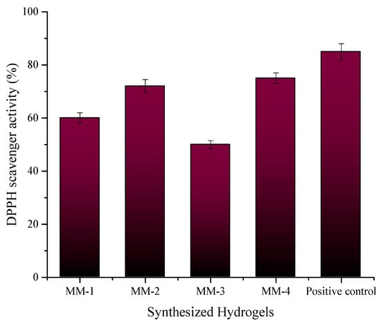 Figure 8 illustrates that MM-1 and MM-2 exhibit the highest water retention capacity. Specifically, MM-2 demonstrates a 440% water retention capacity. The possible reasoning for the highest water retention ability is the presence of PVA (hydrophilic in nature) in a higher ratio, and also many other flavonoids, phenolic acids, and glycyrrhizin (hydrophilic compounds) found in LE. This is especially helpful in establishing a moist environment at the sites of wounds, which is essential for the healing process []. In contrast, MM-3 and MM-4 display lower capacities at 250% and 200%, respectively. This difference may be attributed to the reduced quantity of PVA in these hydrogels.