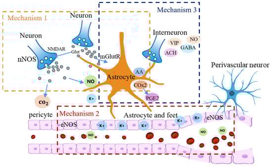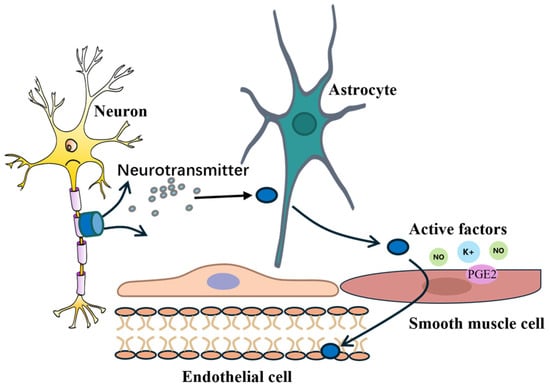 Neurons serve as the fundamental structural and functional units of the brain and are responsible for receiving, integrating, and transmitting signals. Neurons exhibit various morphologies, with a basic structure consisting of a cell body, dendrites, and an axon []. Dendrites receive external stimuli, while axons transmit electrical impulses along established pathways to synaptic terminals, where neurotransmitters are released. Astrocytes detect neuronal activity through membrane-bound receptors and respond by releasing a variety of active factors (prostaglandins, nitric oxide, and potassium ions), which act on endothelial cells and vascular smooth muscle cells to induce vasodilation or vasoconstriction. Endothelial cells play a critical role in modulating the permeability of the vascular wall and integrating the signaling pathways involved in local cerebral blood flow regulation. Vascular smooth muscle cells, in turn, are directly responsible for the dynamic changes in the vessel diameter. This complex and highly coordinated intercellular signaling process is illustrated in Figure 2, which depicts the interactions among neurons, astrocytes, endothelial cells, and smooth muscle cells. Neurons release neurotransmitters that activate astrocytes, which subsequently secrete vasoactive factors acting on the vasculature to modulate the regional cerebral blood flow [].