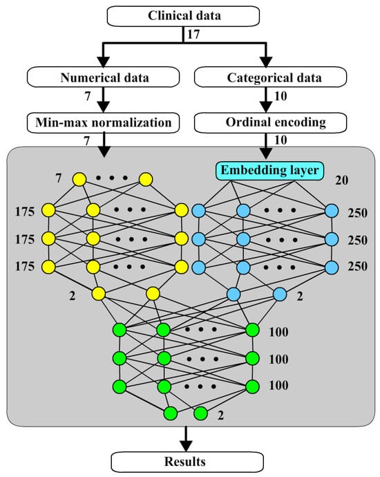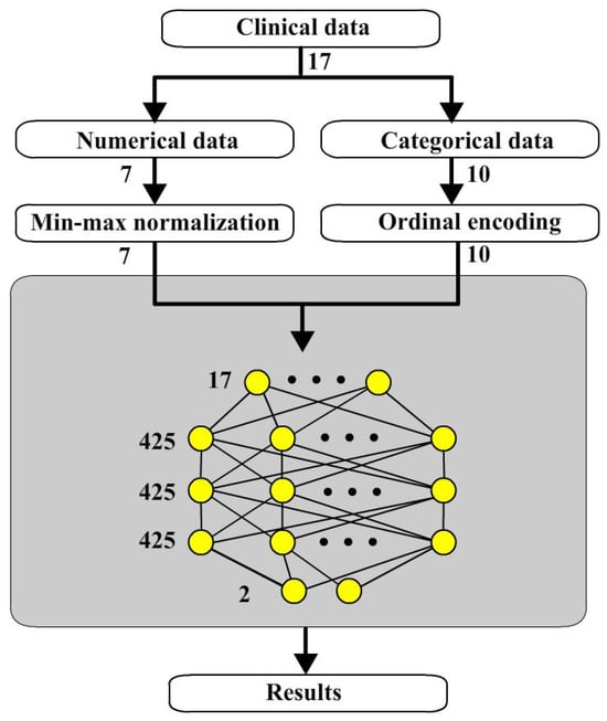 Compared to previous works, it was not until 2023 that Chang [] integrated all practical factors to predict the risk of VRF by using deep learning neural network (DLNN). Utilizing the same variables used to predict VRF with these different approaches is proposed in this study. The data used in this study only contain 145 teeth with 17 variables. The data were collected over a period of six years in Taiwan. Taiwan has a population of approximately 23 million. Limited clinical data size is a common situation faced by medical research in Taiwan. In such situation, support vector machine (SVM) of machine learning (ML) may be similar to original ANNs. The original ANNs could be used as shown in Figure 1. The clinical data are classified into numerical and categorical data normalized separately and then input into to ANNs. In this way, the accuracy of ANNs is 73.1%, a little better than SVM which is 71.7%.