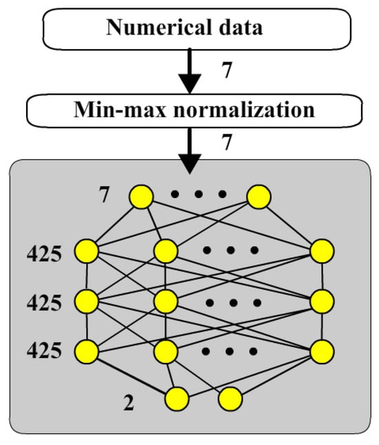 The first stage is to separate the numerical data into min-max normalization and then into a neural network as shown in Figure 2. In our experiments, items no 11 to 17 were in parallel into min-max normalization model to transform data into a uniform range from 0 to 1.