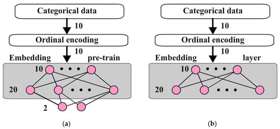 As shown in Figure 3a, a one hidden layer neural network is used for pre-training with samples to obtain the transform parameters. The output nodes are removed like in Figure 3b to obtain an output vector with 20 nodes. This network is an embedding layer to transform the 10 categorical data into a 20-dimensional vector. In pre-train, 20 is the minimum number of hidden nodes able to achieve a good identification in this case.