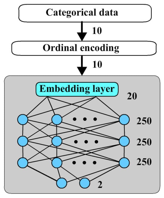 The categorical neural network is structured as Figure 4. Categorical data pass to ordinal encoding and then to neural network. The embedding layer become an input part of this network. It encodes 10 ordinal codes to a 20-dimensional vector.