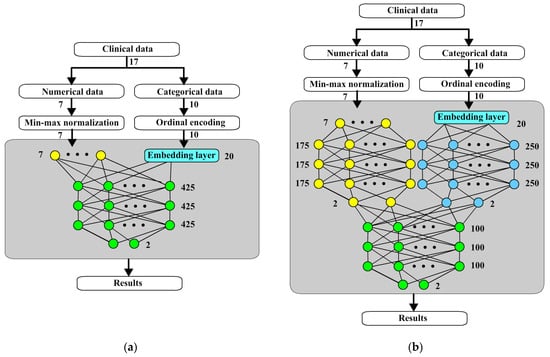 Figure 6 shows two architectures to carry out the comparison of performance. Figure 6a shows a two-way neural network combination of numerical and categorical data without fusion networks. Figure 6b shows the new architecture proposed in this paper. Both of two networks use a similar number of hidden nodes.