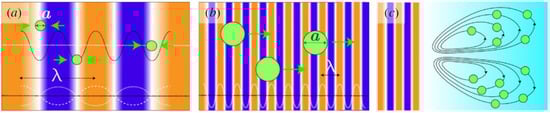 Acoustic radiation forces acting on particles (green dots) in an acoustic field as determined by the particle size () and wavelength (λ) of the soundwave. (a) When , the gradient force acts on the particles and they are trapped in the low-pressure nodes. (b) When , the scattering force acts on the particles and they are moved along the direction of the wave. (c) When , acoustic streaming can result in drag forces that act on the particles [16].