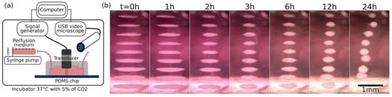 MSC cell sheets self-organize into spheroids when exposed to an acoustic field. (a) Model of the experimental setup where an ultrasonic transducer is used on the cell medium and recorded with a video microscope. (b) Over time, MSC cell sheets orient into spheroids [33].