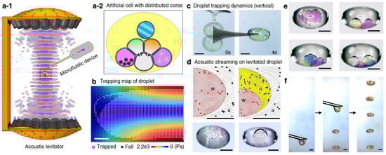 - Li, J.; Jamieson, W.D.; Dimitriou, P.; Xu, W.; Rohde, P.; Martinac, B.; Baker, M.; Drinkwater, B.W.; Castell, O.K.; Barrow, D.A. Building Programmable Multicompartment Artificial Cells Incorporating Remotely Activated Protein Channels Using Microfluidics and Acoustic Levitation. Nat. Commun. 2022, 13, 4125. [Google Scholar] [CrossRef]