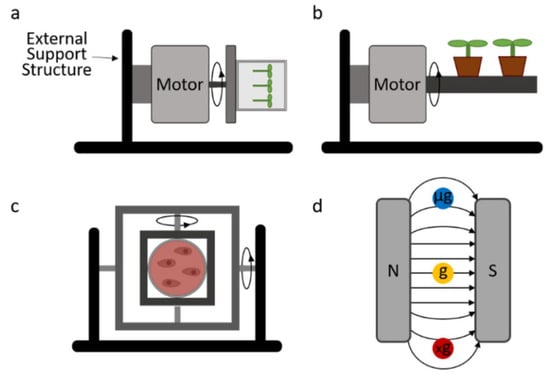Common ground-based microgravity simulators. (a) One-dimensional clinostat. (b) Two-dimensional clinostat. (c) Three-dimensional clinostat/RPM. (d) Diamagnetic levitation [40].