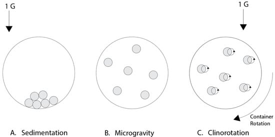 Demonstration of how a fast-rotating clinostat simulates microgravity. Without rotation, there is sedimentation of the particles due to gravity (A). In microgravity, there is uniform distribution throughout the container due to a lack of gravitational force (B). With clinostat rotation, the particles move in a circular pattern (C) (note: the particle rotation observed in C is relative to the container). As the speed of rotation increases to a certain point, the radius decreases until the particle is nearly static, similar to microgravity. Adapted and redrawn from [48].