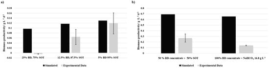 28]. Among the diluted BD compositions, 5% BD yielded the highest biomass productivity, while 12.5% BD showed reduced productivity, and 25% BD failed to support microbial growth. The improved performance of BD concentrate-based media may be attributed to higher light intensities. However, despite this advantage, biomass productivity remained below simulated expectations, suggesting a nutrient imbalance may have affected growth efficiency.