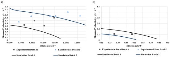 In batch cultivation, all BD-based media resulted in lower biomass productivity than the values simulated based on the model based on Jung et al. [