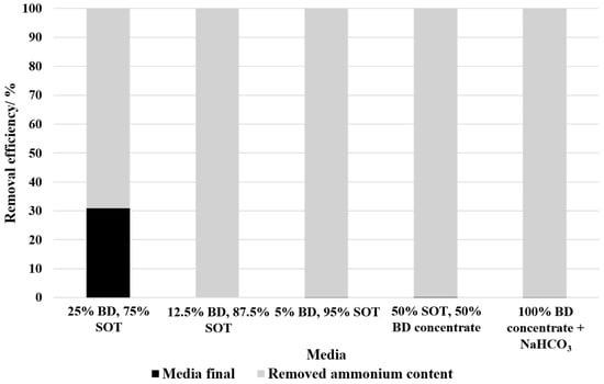 Ammonium removal efficiencies were consistently high (>99%) across most media compositions in batch mode, except for 25% BD, which showed 69.15% removal despite no microbial growth, suggesting passive ammonium loss rather than biological uptake. In continuous cultivation, ammonium removal remained consistently high across all dilution rates, with 50% BD concentrate achieving >99% efficiency and 100% BD concentrate slightly lower, at a minimum of 98%. Consequently, the availability of nitrogen may be a limiting factor. However, media compositions mixed with SOT containing nitrate as an additional nitrogen source.
