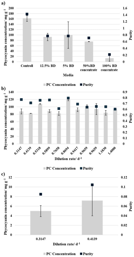 PC production was strongly influenced by media composition. In batch cultivation, the control medium (SOT) achieved the highest PC concentration and purity. Cultures grown in 12.5% and 5% BD exhibited similar PC yields, whereas 50% BD concentrate resulted in lower PC concentrations and purity compared to BD-based media. The lowest PC yield (<20 mg g−1) and purity were observed in 100% BD concentrate, likely due to nutrient imbalances. In continuous cultivation, no correlation between dilution rate and PC yield was found, but 50% BD concentrate consistently outperformed 100% BD concentrate in both PC concentration and purity. In comparison to the batch cultivation, the PC concentration with 50% BD concentrate was similar or higher during continuous cultivation and for 10% BD concentrate even lower.